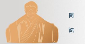 問訊者以兩手相屈,曲腰至膝,操手下去、合掌上來,兩手拱齊眉,謂之問訊。凡問訊,須曲腰至半,不得過與不及。